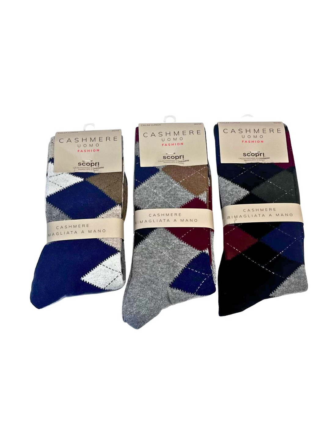 LONG men's patterned sock made with a percentage of cashmere, hand-linked.