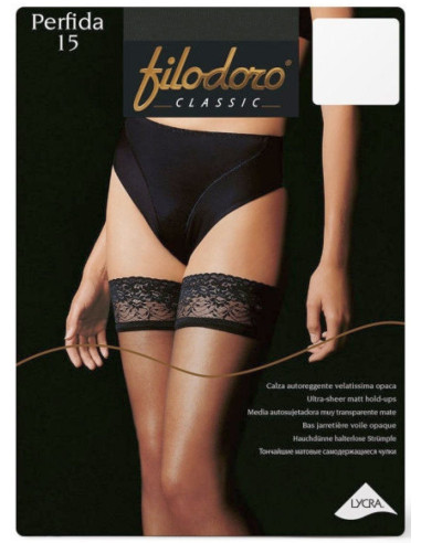 Ultra sheer hold-ups 15 den. opaque with precious silicone lace flounce.