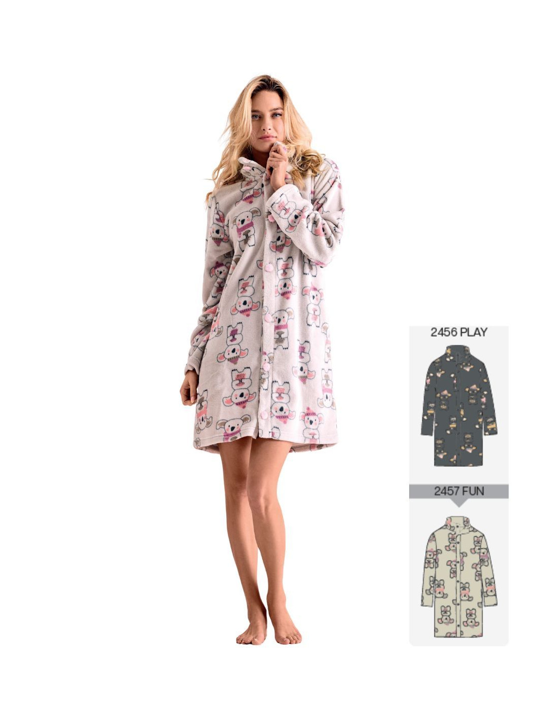 Short women's dressing gown with buttons in WARM and soft CORAL PAIL with koala pattern.