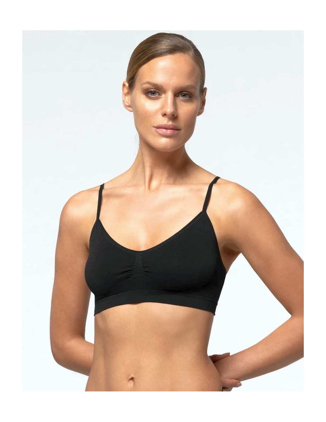 Narrow shoulder brassiere in soft seamless microfiber, with flat finishes and anatomical and functional areas with the Q-SKIN® odor control yarn by Fulgar. Comfortable and light, it features a LYCRA® fiber stretch band.
