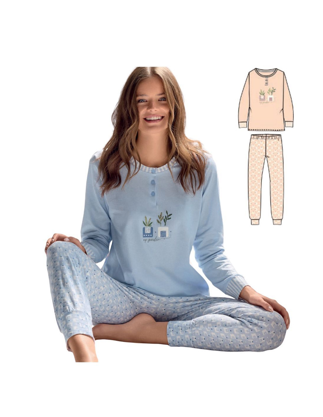 Women's long-sleeved cotton jersey pajamas with small print and patterned pants with cuffs.