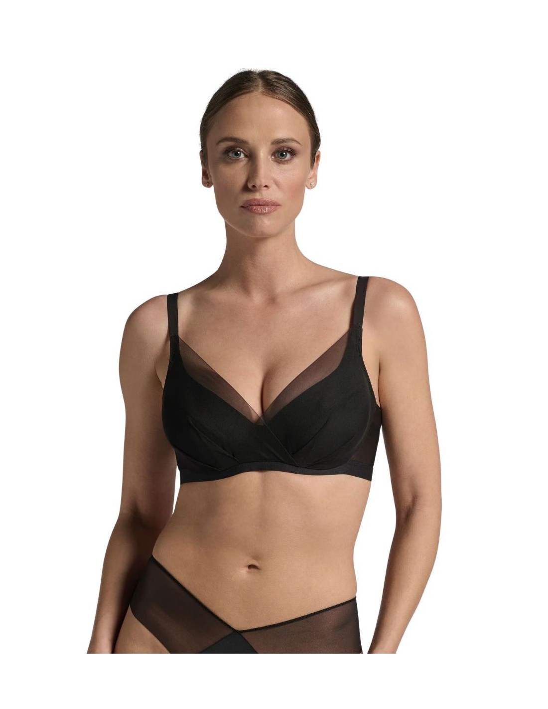 Unlined underwired bra in microfiber with micro tulle inserts. It features a Powernet tulle ruffle that provides effective underarm support without creating a visible crease, for a soft and reassuring fit. The low-cut neckline is elegantly veiled by 20 denier tulle that crosses over the front, embellished with the series' signature pleats, lending the piece a sophisticated elegance and a surprisingly modern fit.