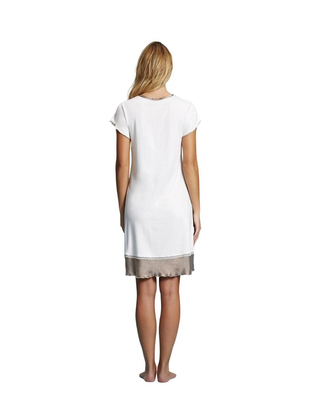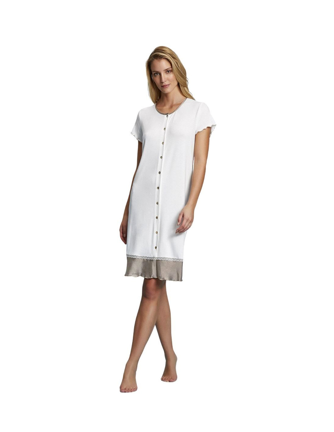 Women's half sleeves FULL OPENED nightdress in viscose jersey with patterned satin inserts, lace profile.