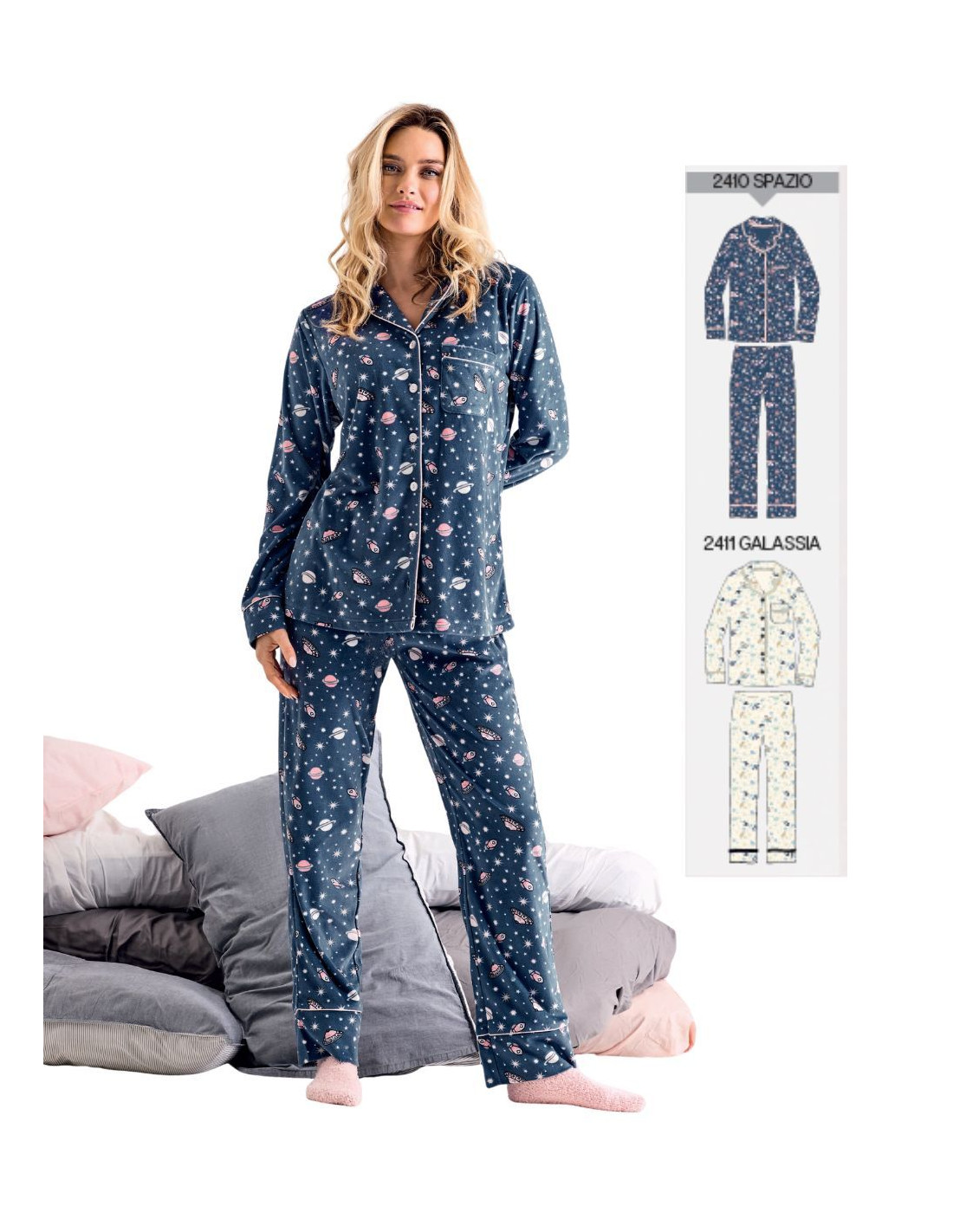 Women's opened pajamas in warm and soft coral micro pile with spaceships pattern and pants without cuffs.