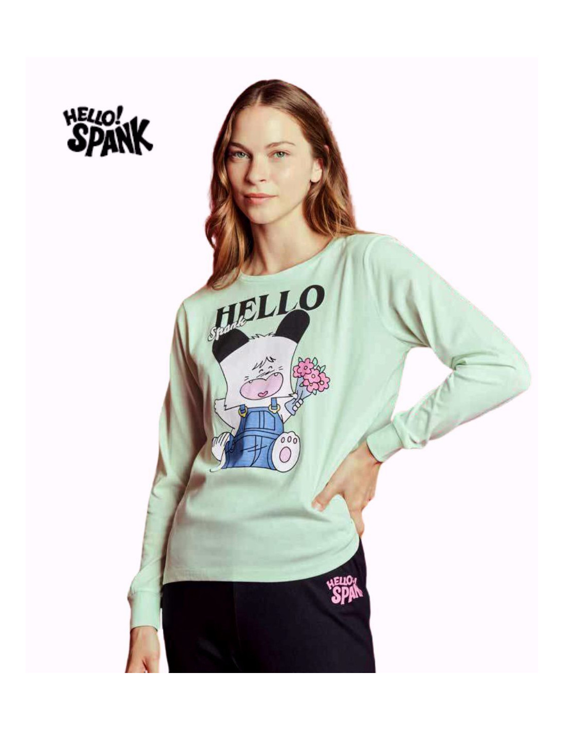 Women's seraph pajamas in cotton jersey with Hello Spank print and long one color trousers with cuffs.