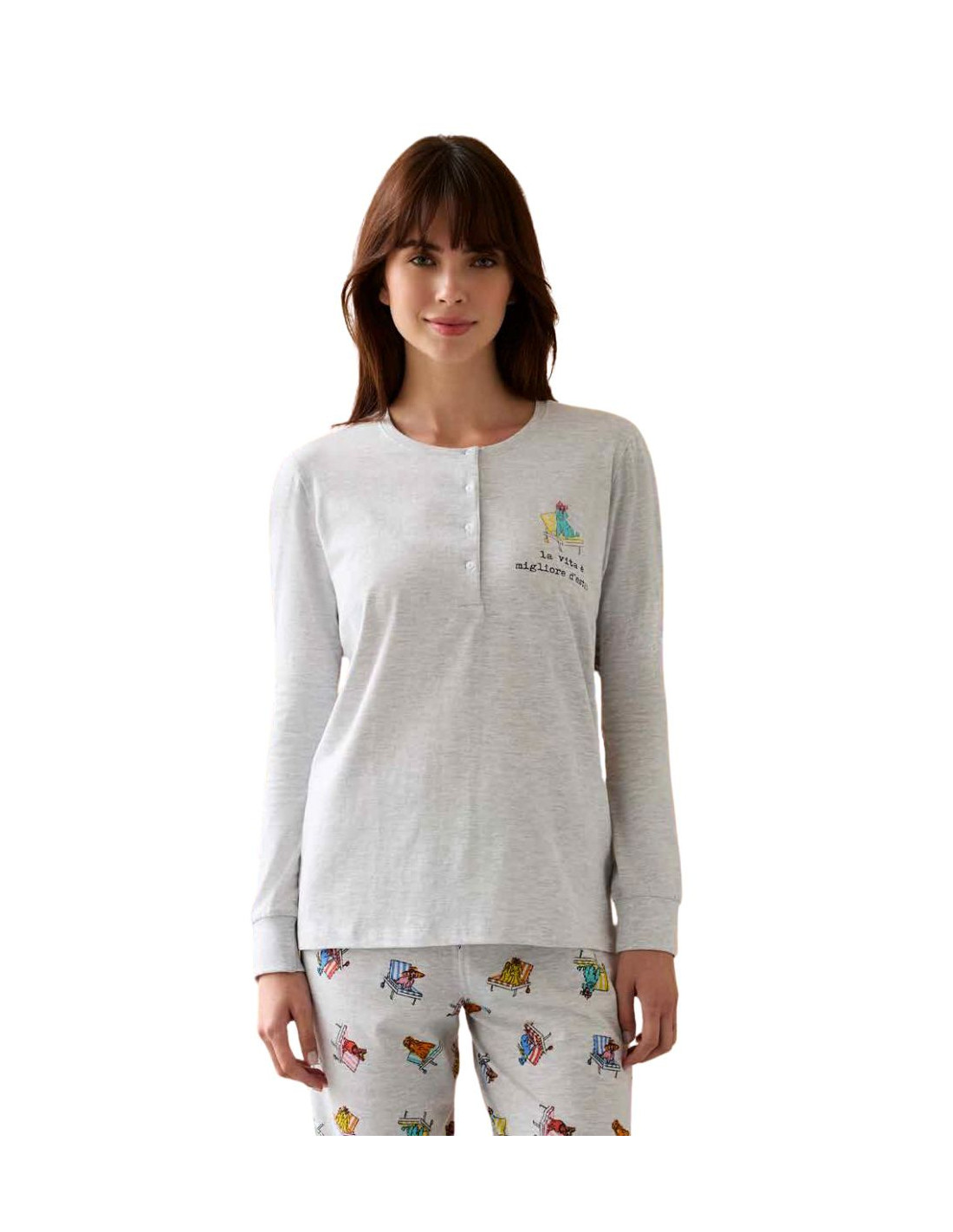 Women's cotton jersey henley pajamas with a "Life is Better in Summer" print and long patterned trousers with cuffs.