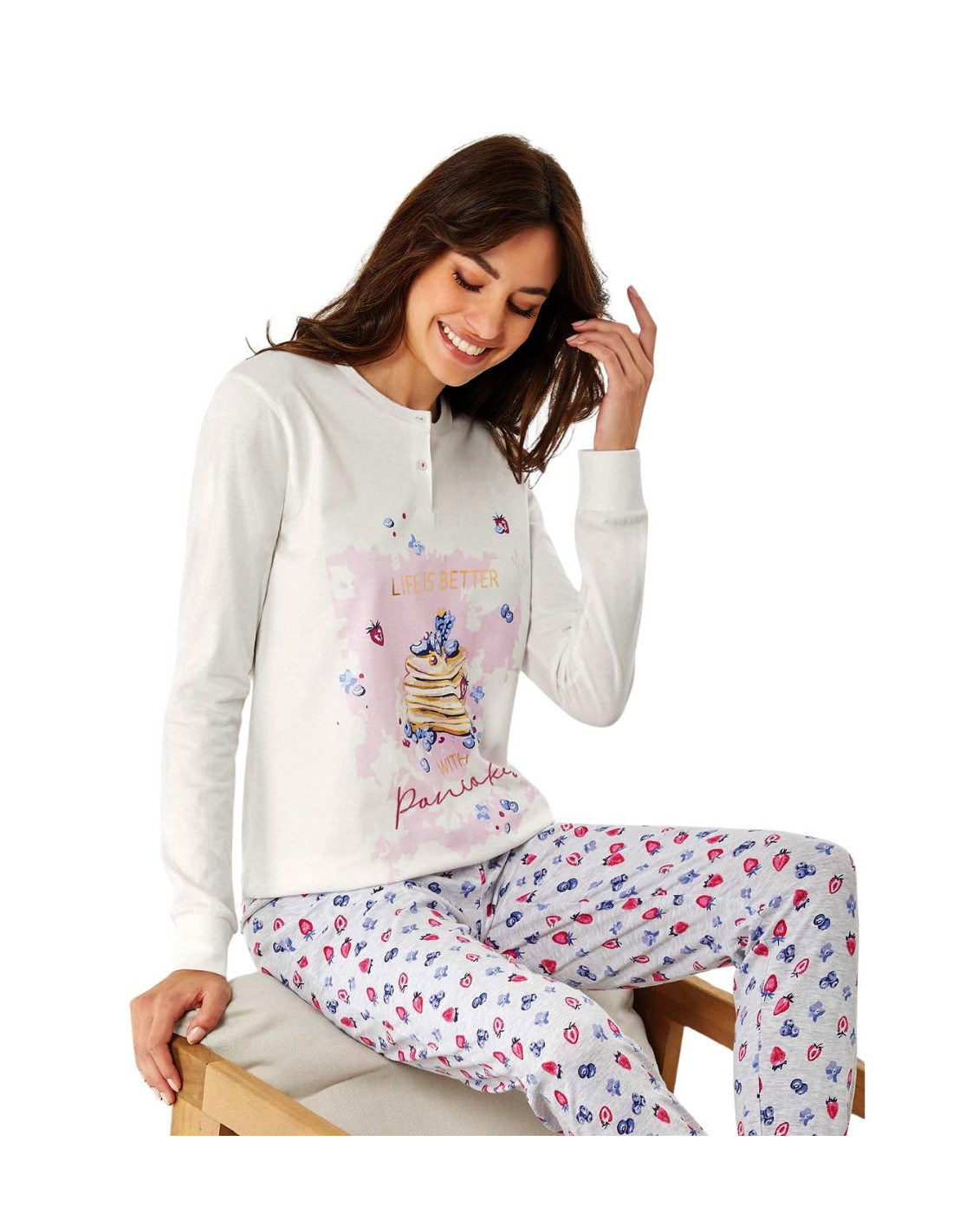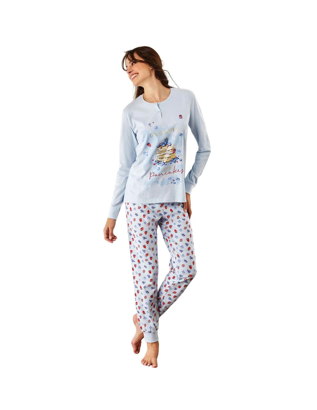 Women's henley pyjamas in cotton jersey with printing and long patterned trousers with cuffs.
