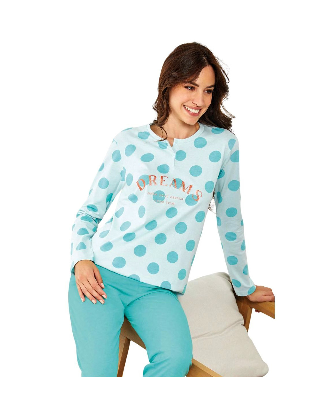 Women's seraphine pyjamas in cotton jersey with maxi pois pattern and long trousers with cuffs.