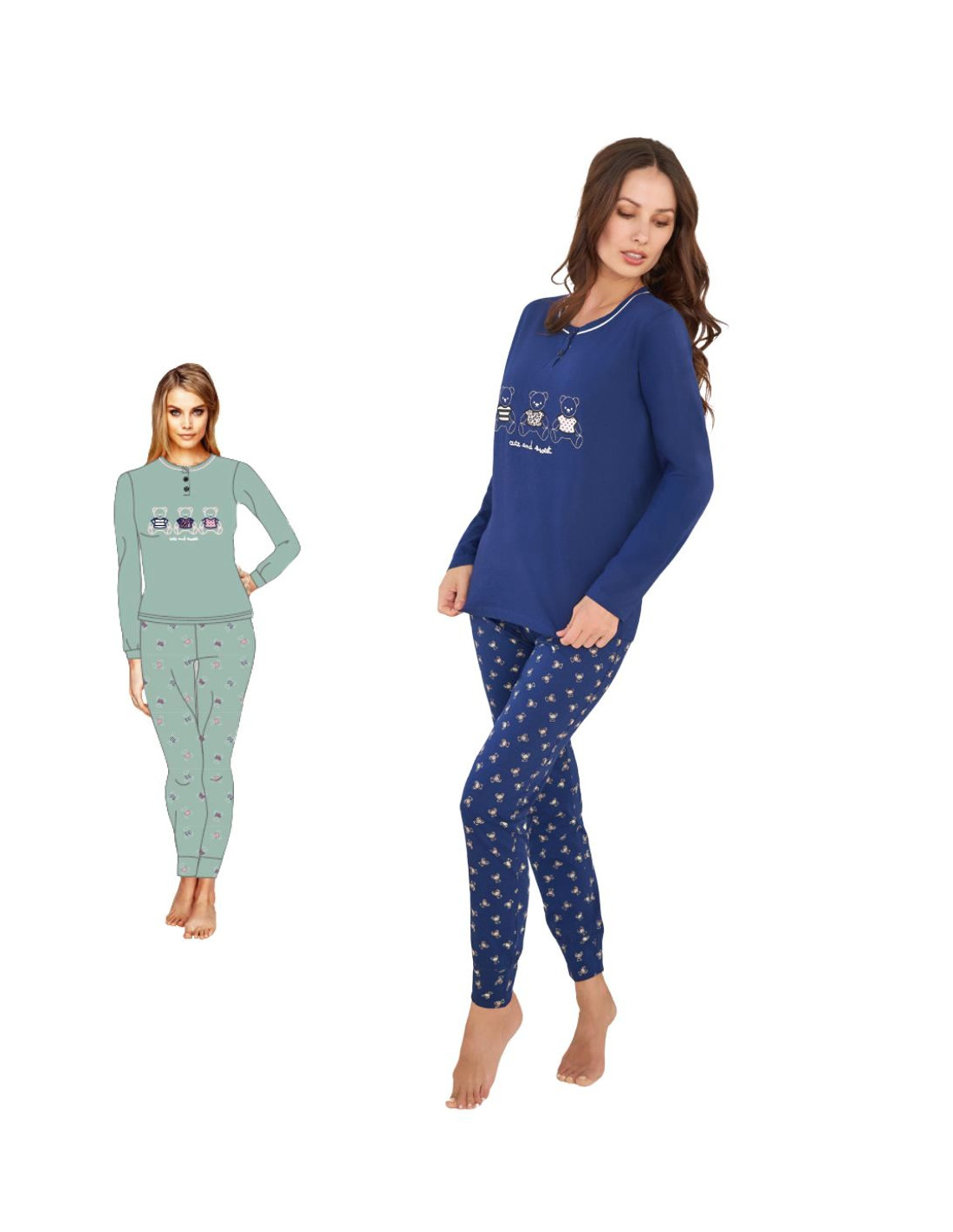 Women's cotton jersey henley pyjamas with embroidered teddy bears and patterned trousers with cuffs.