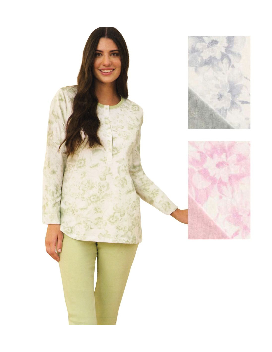 Seraphine long sleeves cotton jersey pajamas with floral pattern long pants without cuffs.