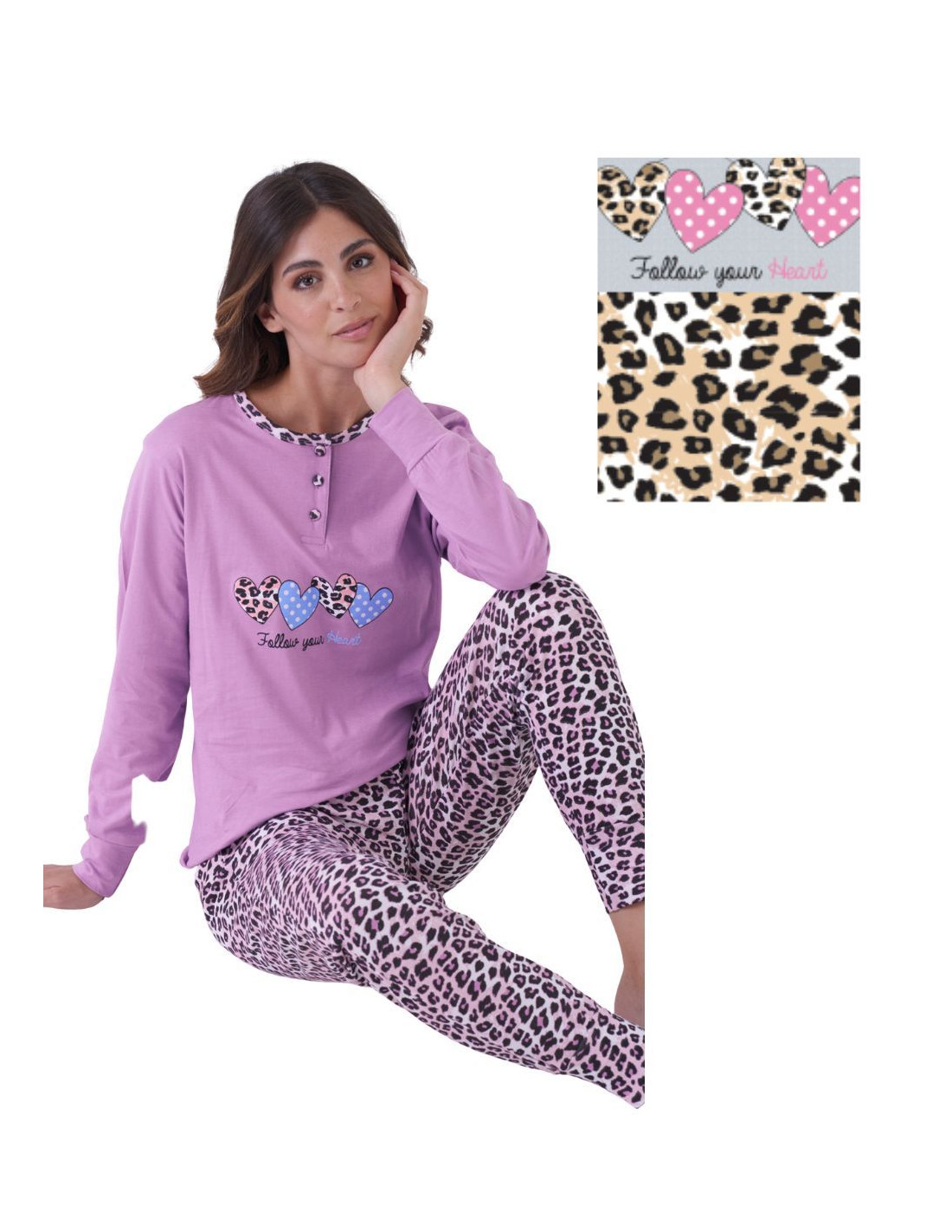 Women's seraph pajamas in cotton jersey with print and long patterned trousers with cuffs.