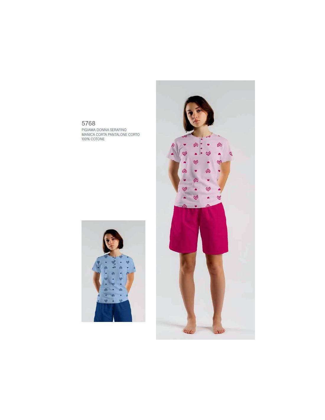 Women's short-sleeved pajamas in hearts patterned cotton jersey and short trousers.