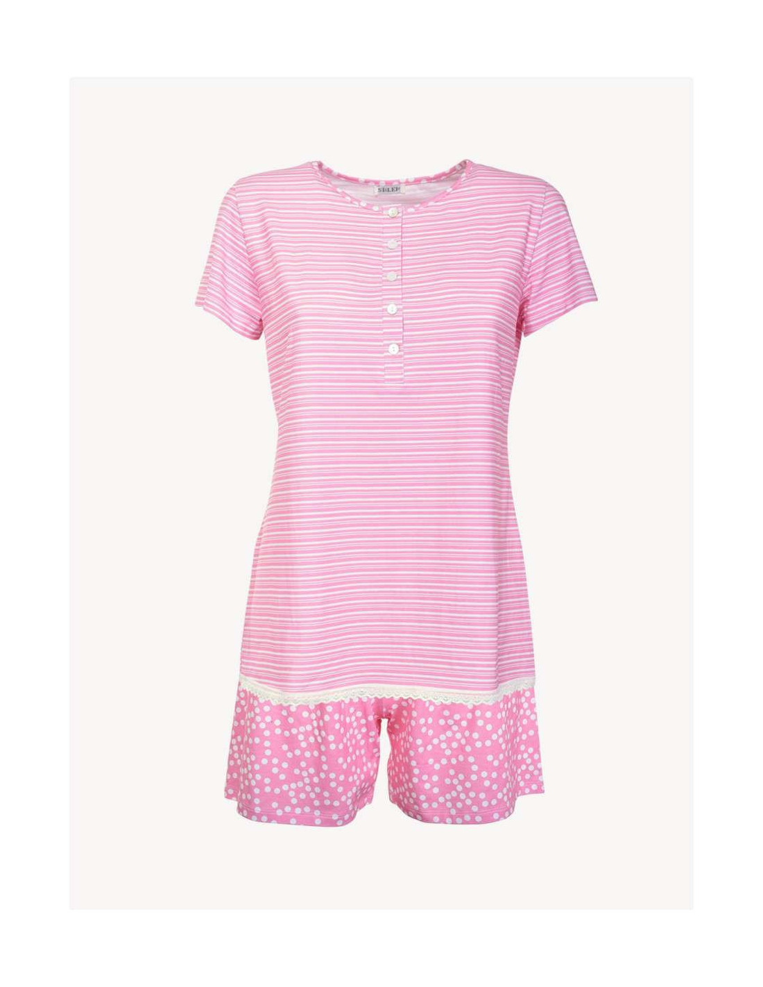 Women's pajamas with short-sleeved shirt and short shorts. Her neck opens with 5 buttons. The fabric is in stretch cotton, printed with stripes and polka dots and enriched with an ivory-colored lace pin.