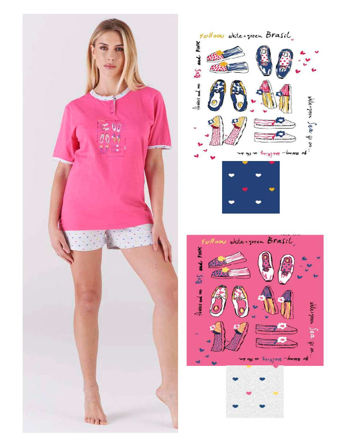 Women's seraph short-sleeved pajamas in cotton jersey with print and small hearts patterned shorts.