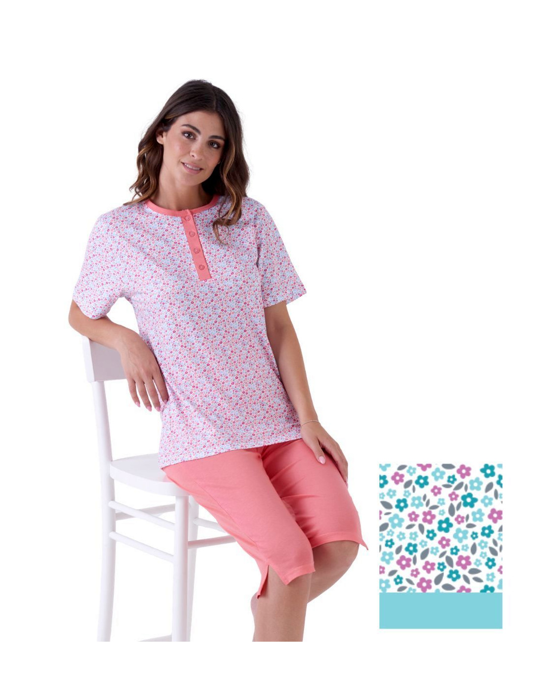 Women's pyjamas with short sleeves in cotton jersey with small floral pattern and one color Capri pants.