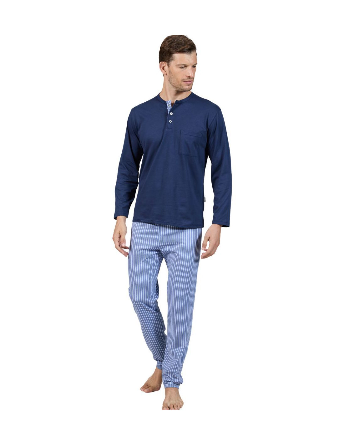 Seraphine one color cotton jersey men pyjamas with striped long trousers without cuffs.