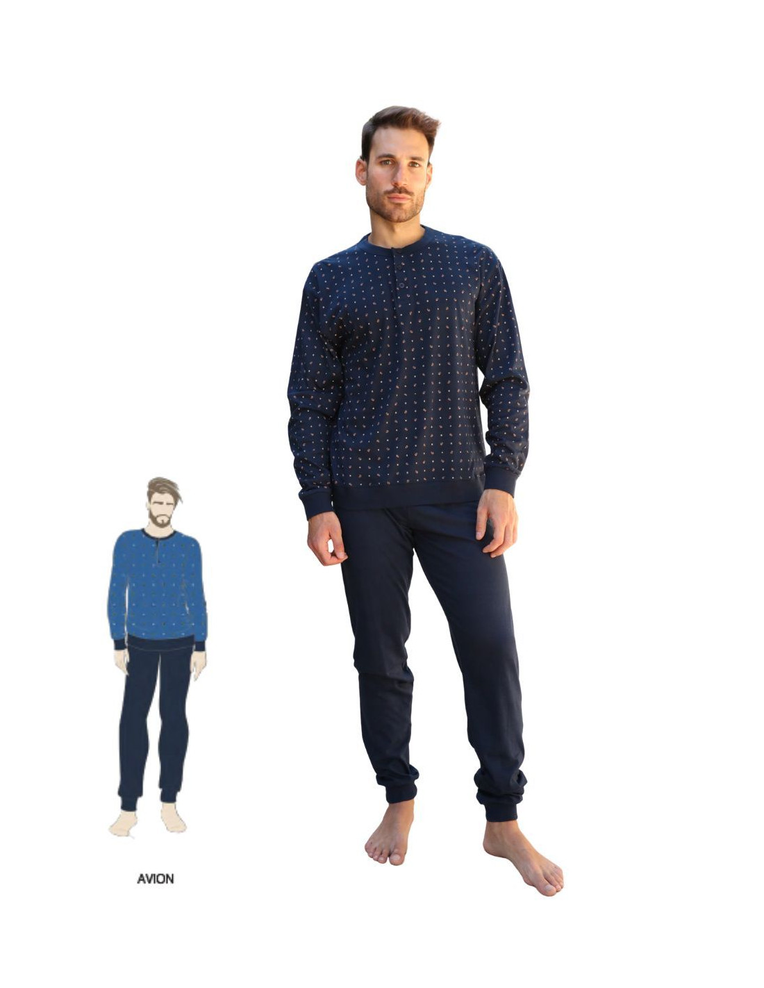 Fine patterned cotton jersey men pajamas with seraph neck and long pants with cuffs.