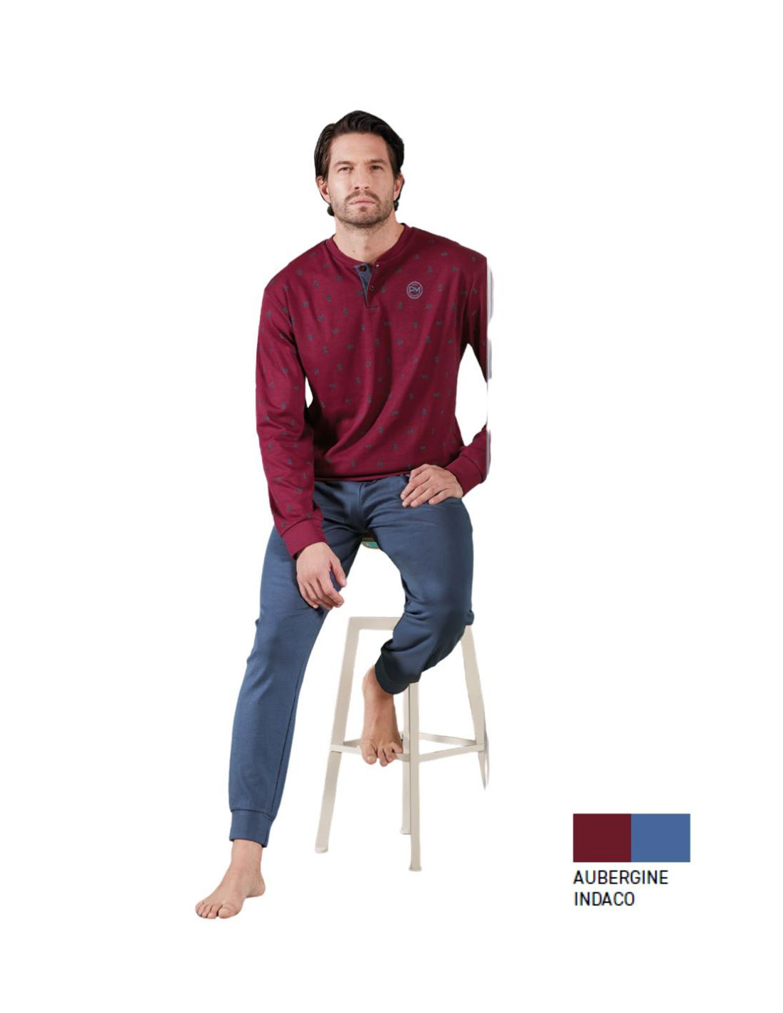 Men's henley pyjamas in warm cotton jersey (medium weight) with a coffee maker pattern and trousers with cuffs.