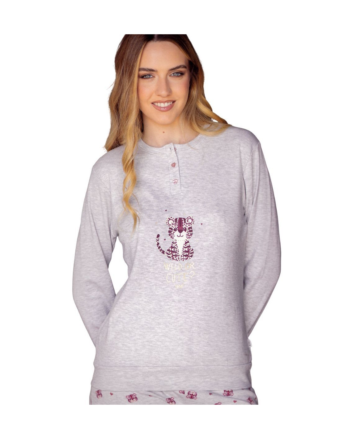 Women's henley pajamas in warm cotton jersey (medium weight) with tiger cub printing and patterned pants with cuffs.