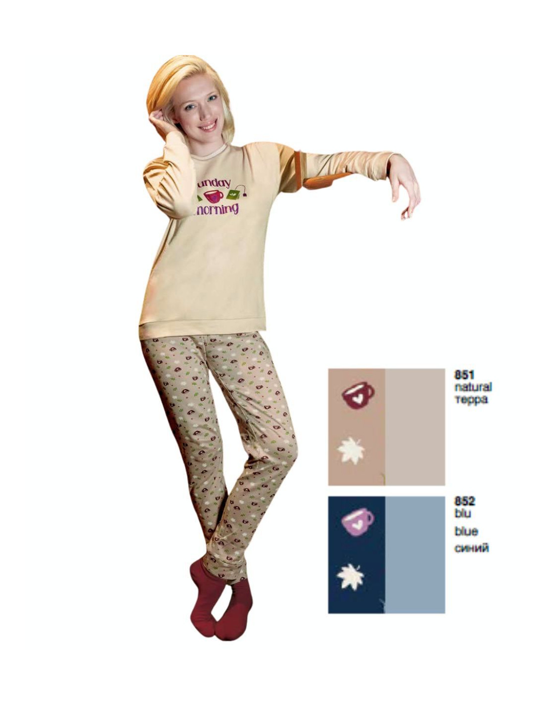 Women's crew-neck pajamas in warm cotton jersey (medium weight) with a central print and patterned pants with cuffs.