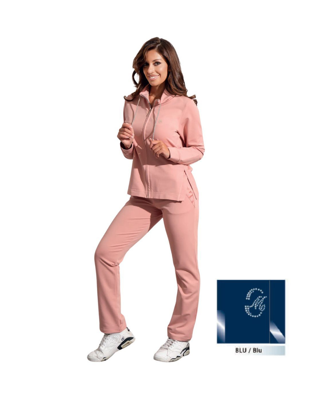 Spring women's tracksuit in stretch cotton, jacket with zip and collar, rhinestone logo. Straight trousers in solid color with elasticated waist.