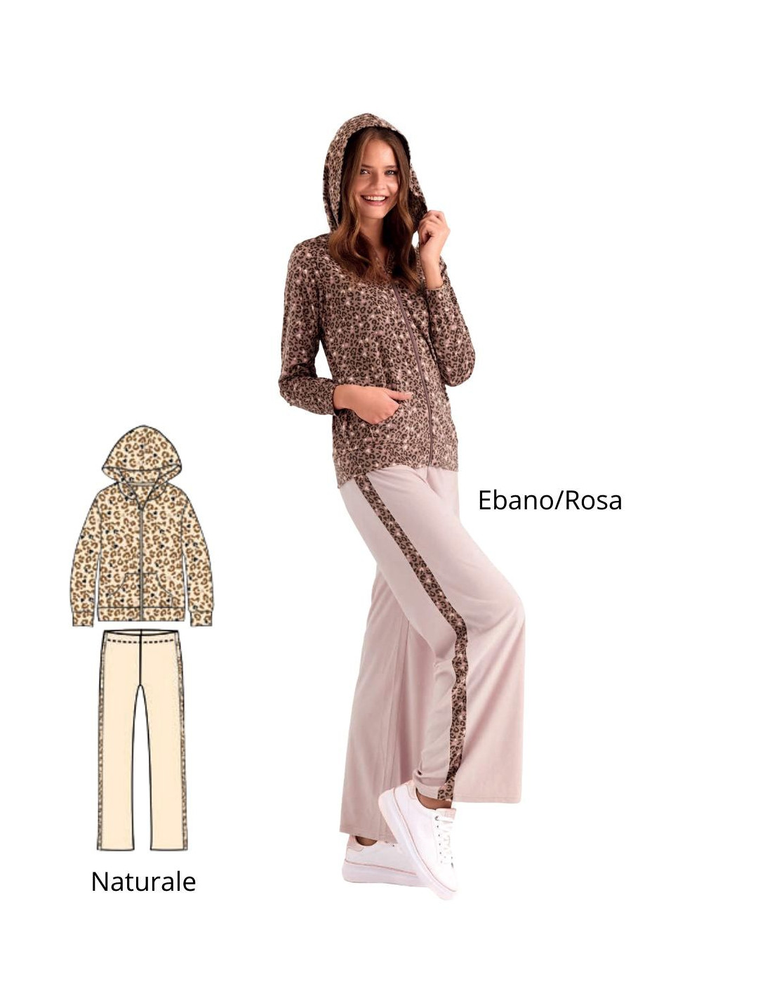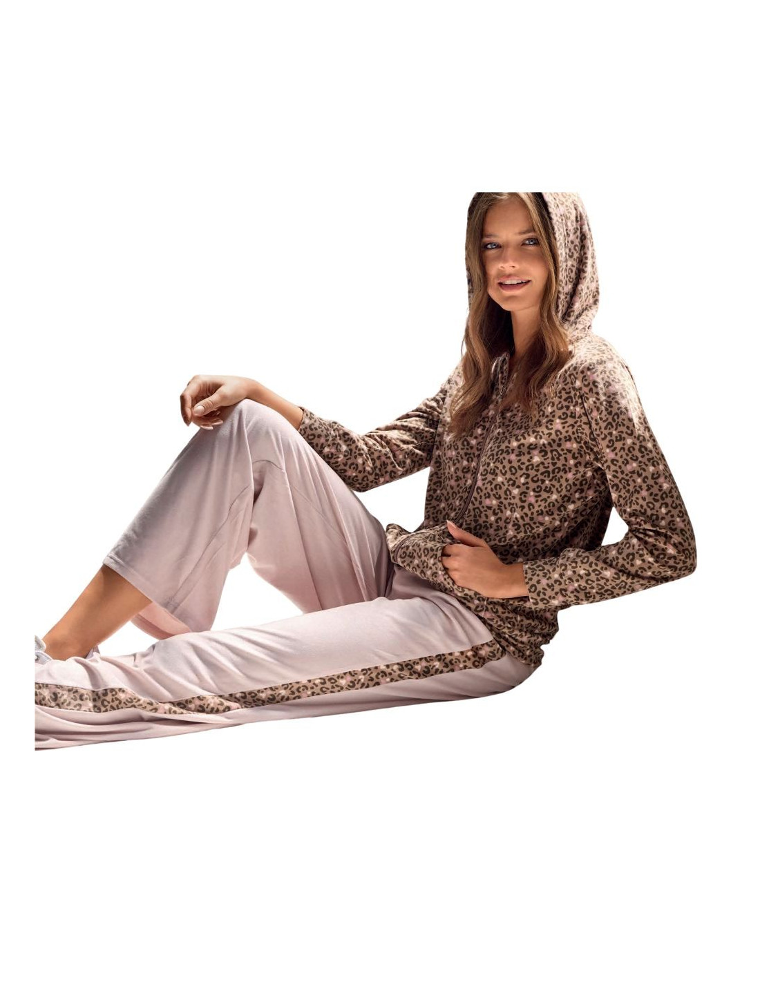 Women's opened patterned jumpsuit with zip, hood and pockets, long pants with bands.
