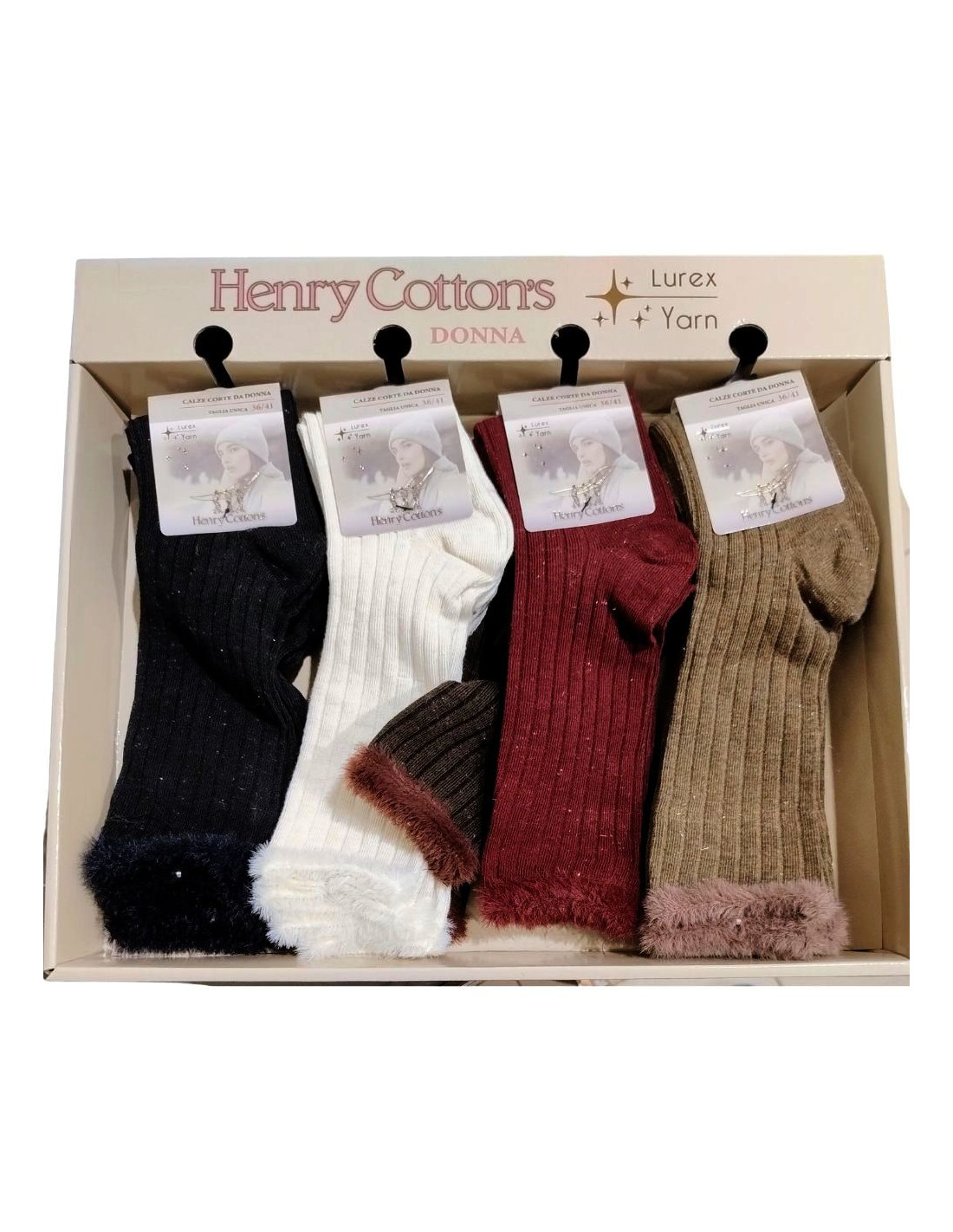 Women's short socks in warm cotton with a ribbed pattern and fur trim.