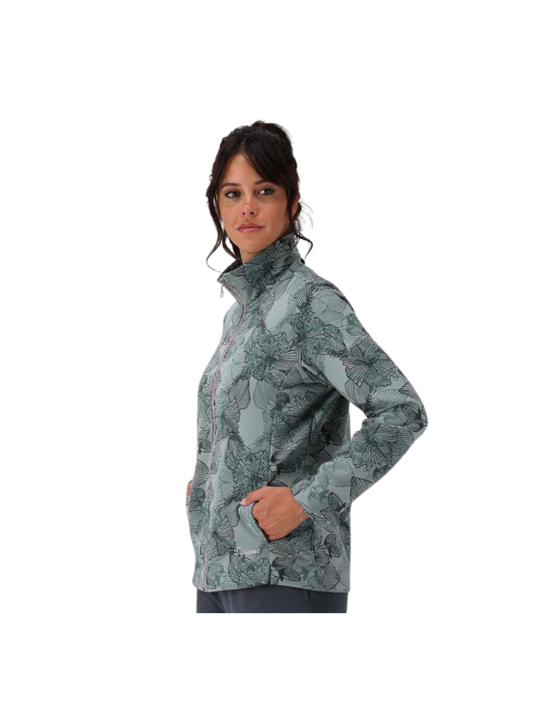 Tuta donna ideale per la mezza stagione composta da giacca con chiusura con zip frontale a fantasia floreale, colletto con interno a contrasto e tasche laterali con zip e pantalone elasticizzato.