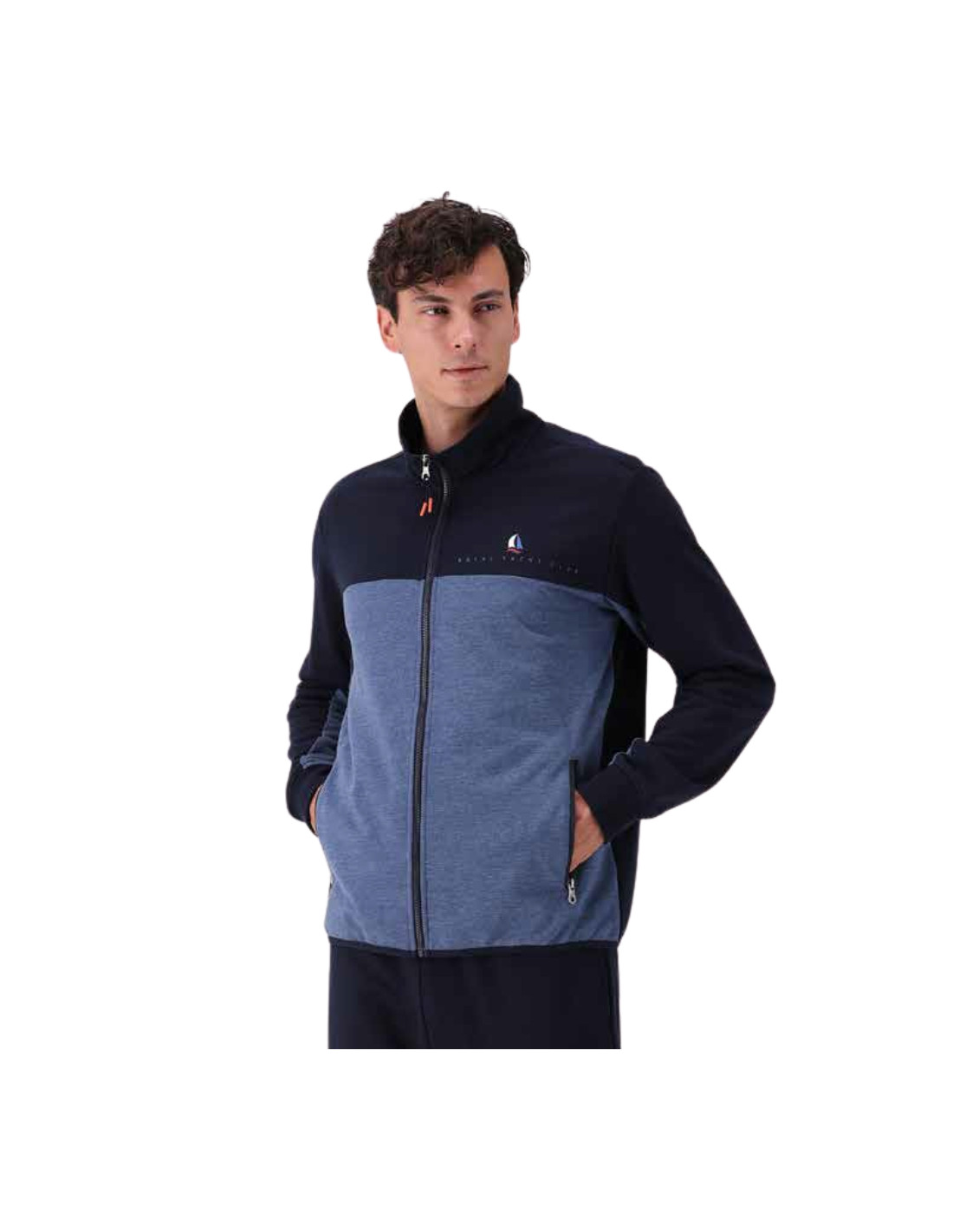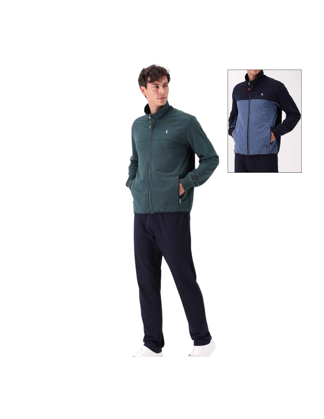 Tuta uomo in cotone garzato con apertura zip a tutta lunghezza, colletto e tasche laterali e pantalone con tasche ed elastico con coulisse in vita.
