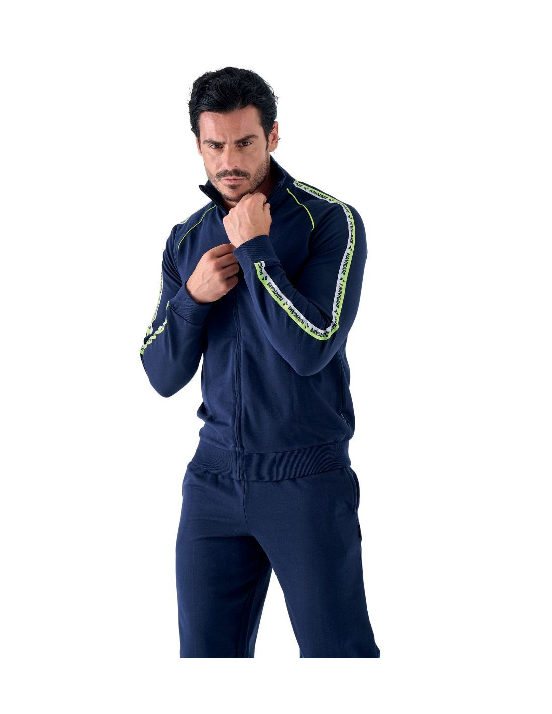 Tuta uomo in misto cotone garzato composta da maglia con cerniera a tutta lunghezza, colletto, fascione in vita, tasche aperte frontali, dettaglio logo sul braccio e spalle a contrasto, e pantalone tinta unita con tasche aperte e polsini.