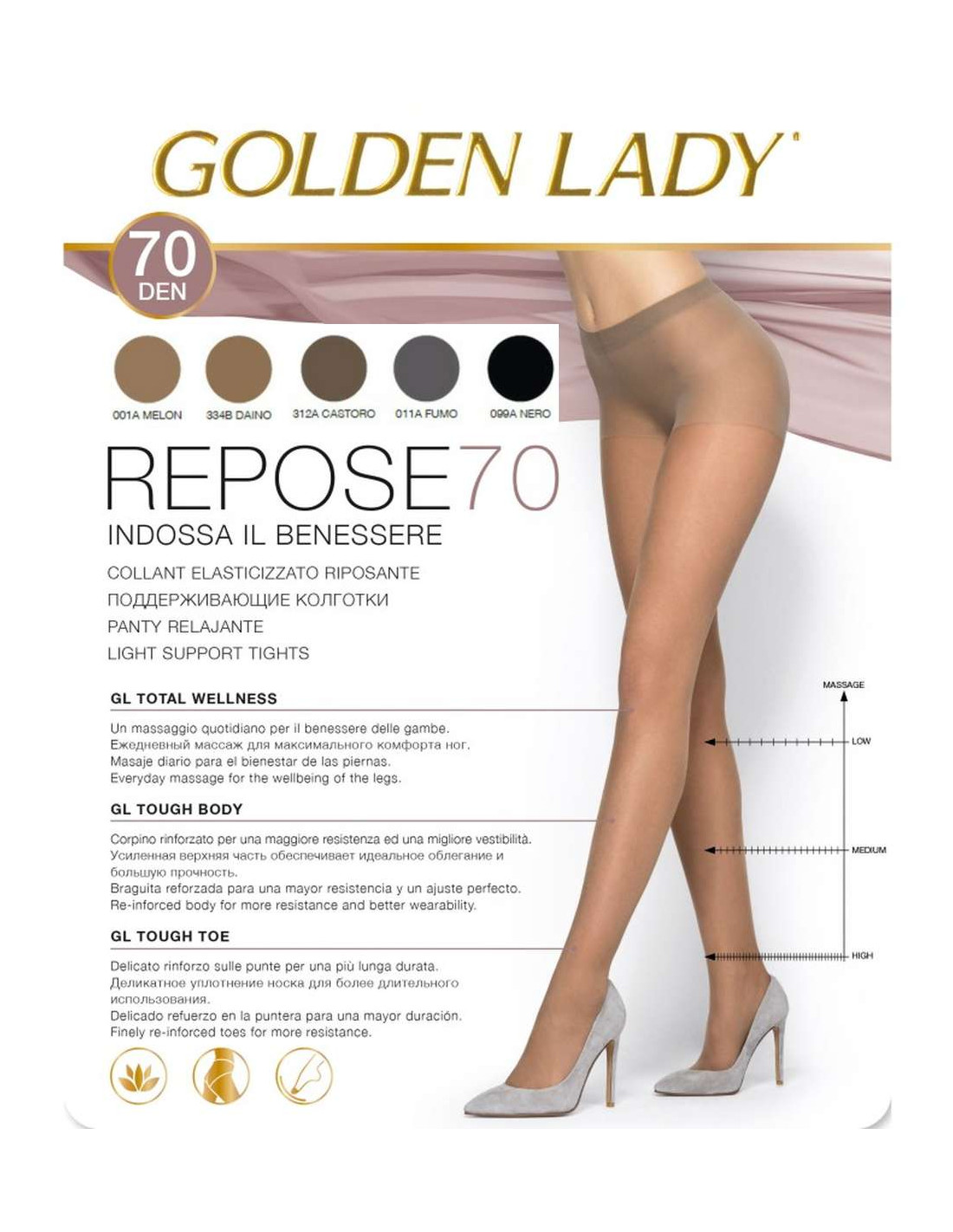 Collant Golden Lady riposante 70 denari elegante e semi-velato, tassellino in cotone, corpino leggermente contenitivo e svolge una moderata azione defaticante. Massaggio quotidiano per il benessere delle gambe. Corpino rinforzato per una maggiore resistenza e vestibilità. Delicato rinforzo sulle punte per una più lunga durata.
