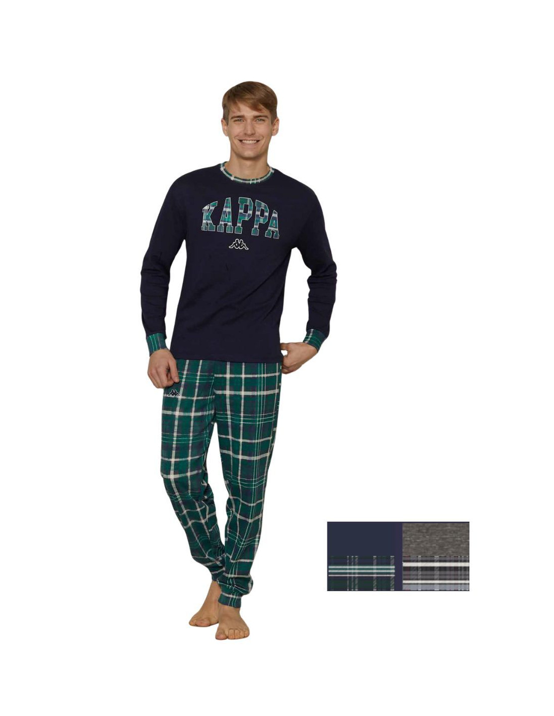 Pigiama uomo girocollo in jersey di cotone caldo (medio peso) con stampa logo e pantalone scozzese con polsini.