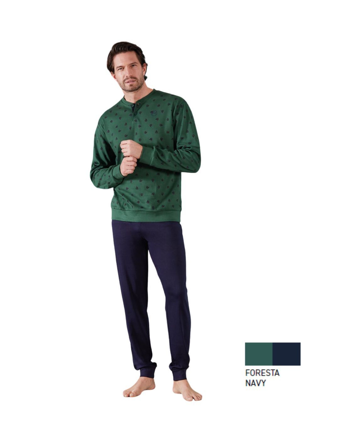 Pigiama uomo a serafino in jersey di cotone caldo (medio peso) fantasia berrette e pantalone con polsini.