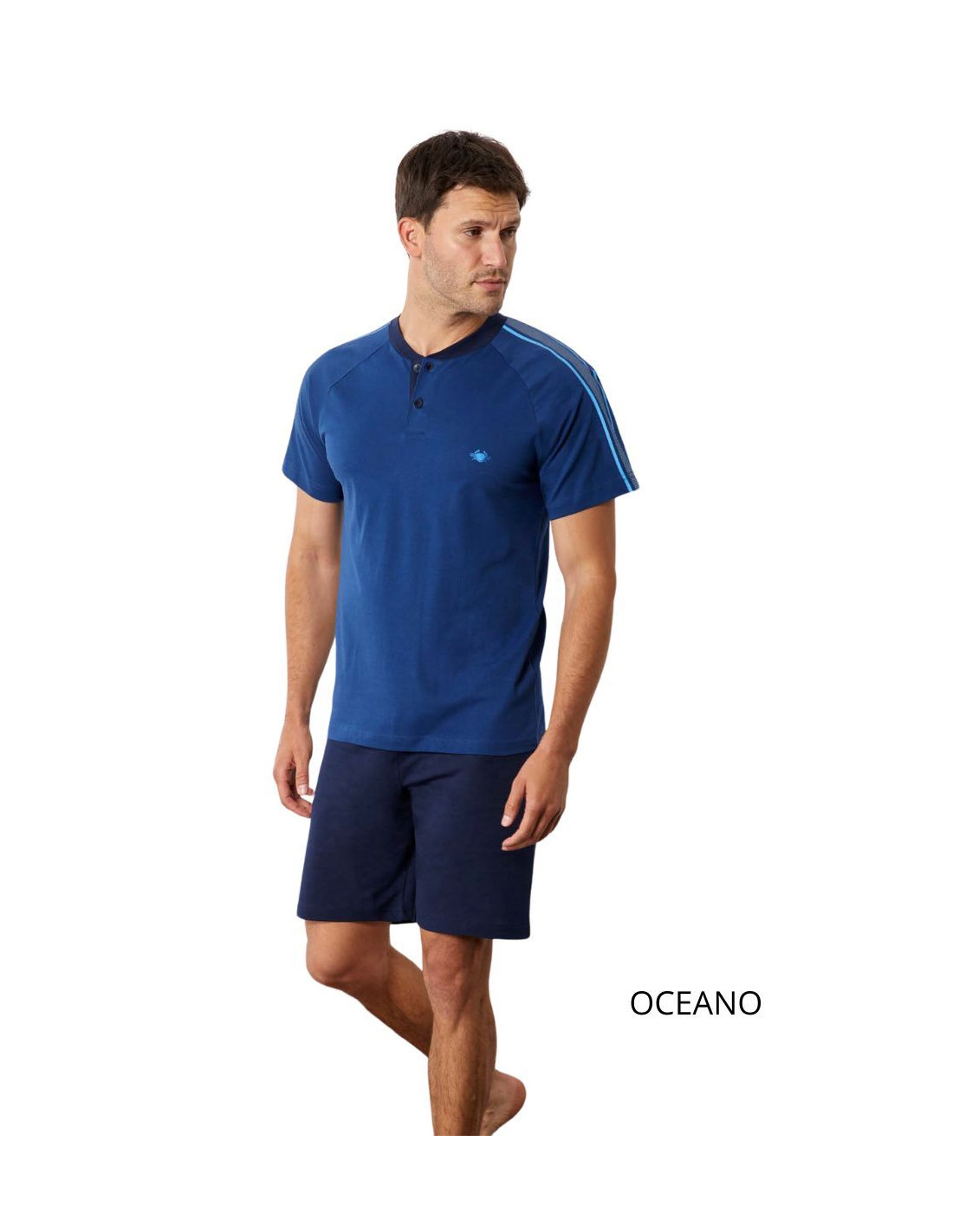 Pigiama uomo a serafino in jersey di cotone con logo, bande colorate e pantalone corto.