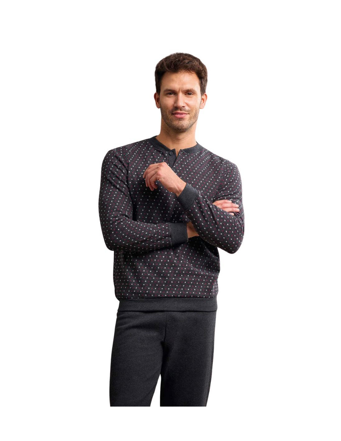 Pigiama uomo a serafino in caldo jersey di cotone lanato (punto Milano) in micro fantasia e pantalone con polsini.