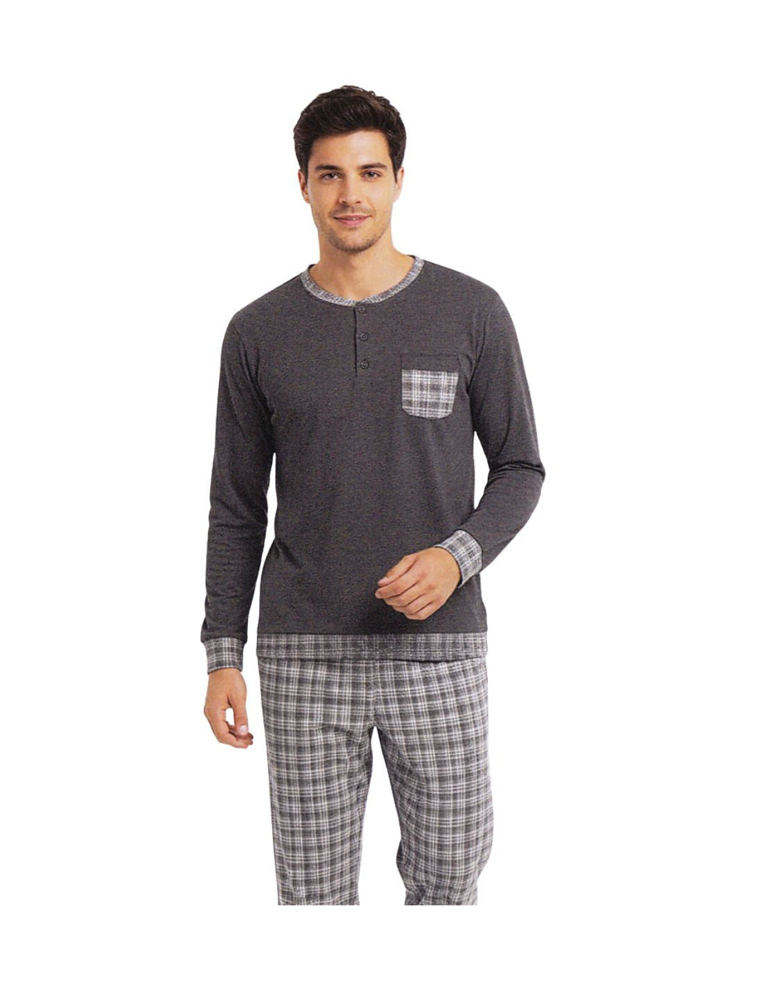 Pigiama uomo a serafino in caldo jersey di cotone lanato (punto Milano) con taschino e pantalone a quadretti con polsini.