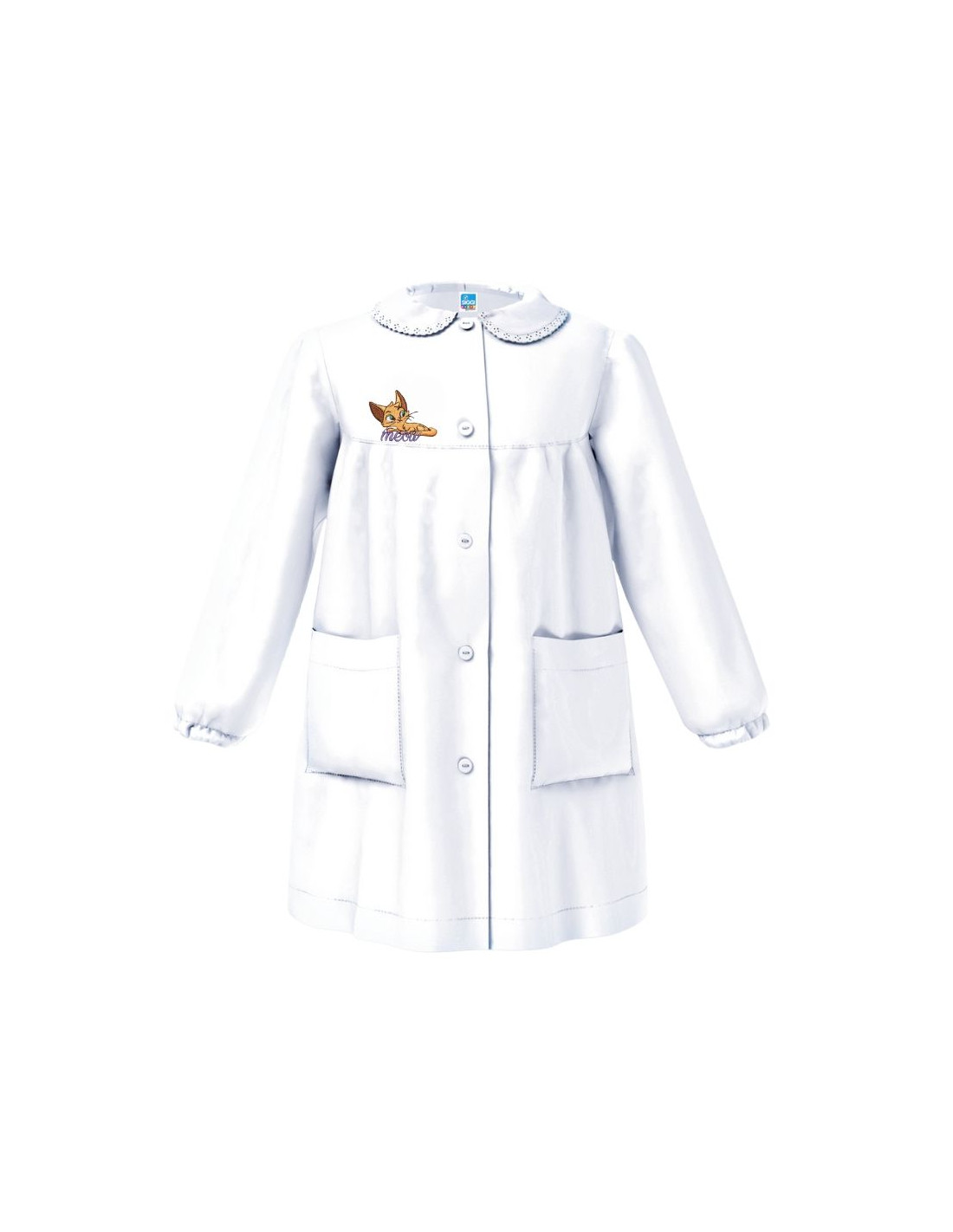 Grembiule scuola da bambina dotato di chiusura con bottoni, colletto removibile e tasche, ricamo gatto.