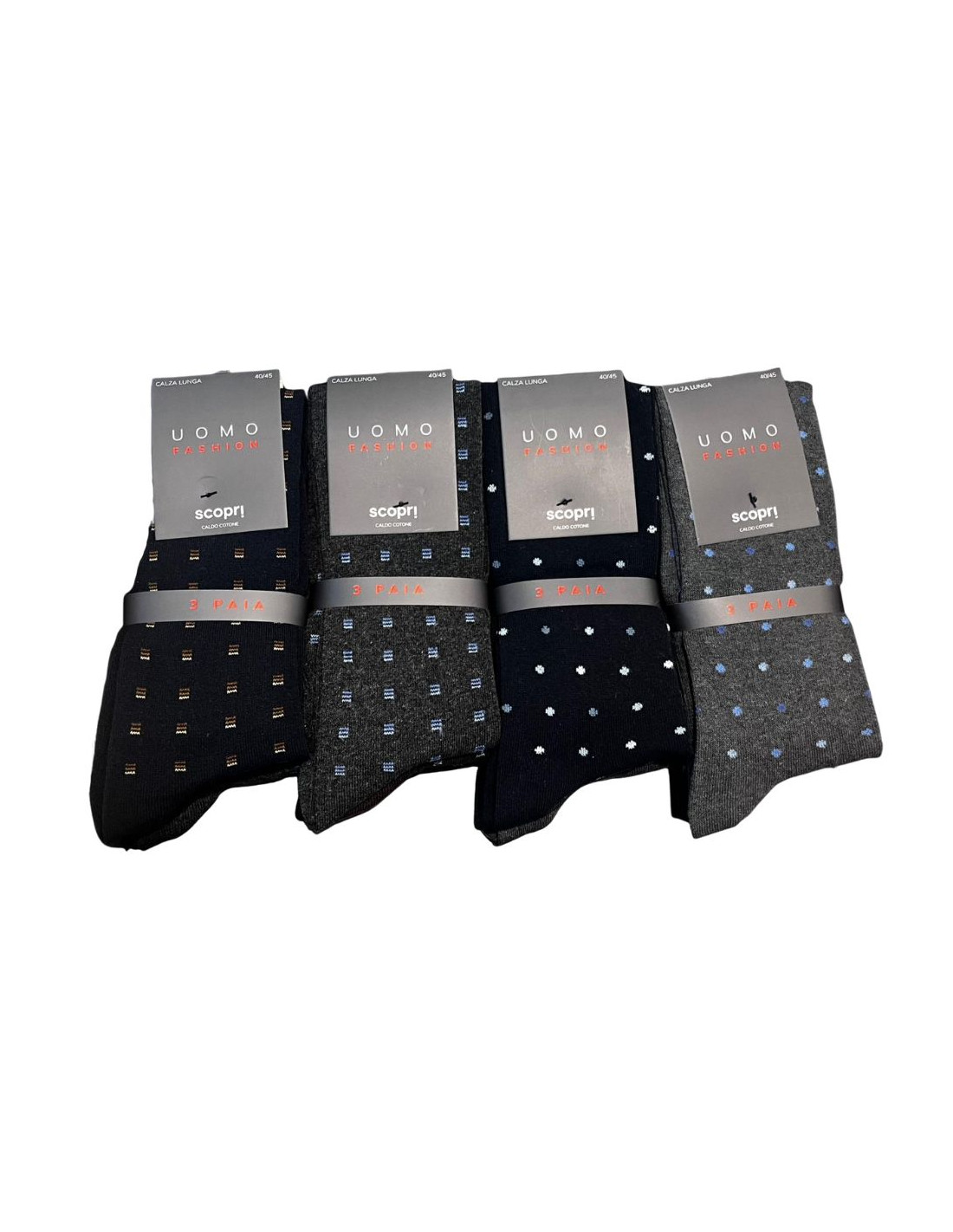 Gruppo di 3 calzini LUNGHI uomo realizzato in caldo cotone elasticizzato con motivo pois e quadretti. TRI-PACK