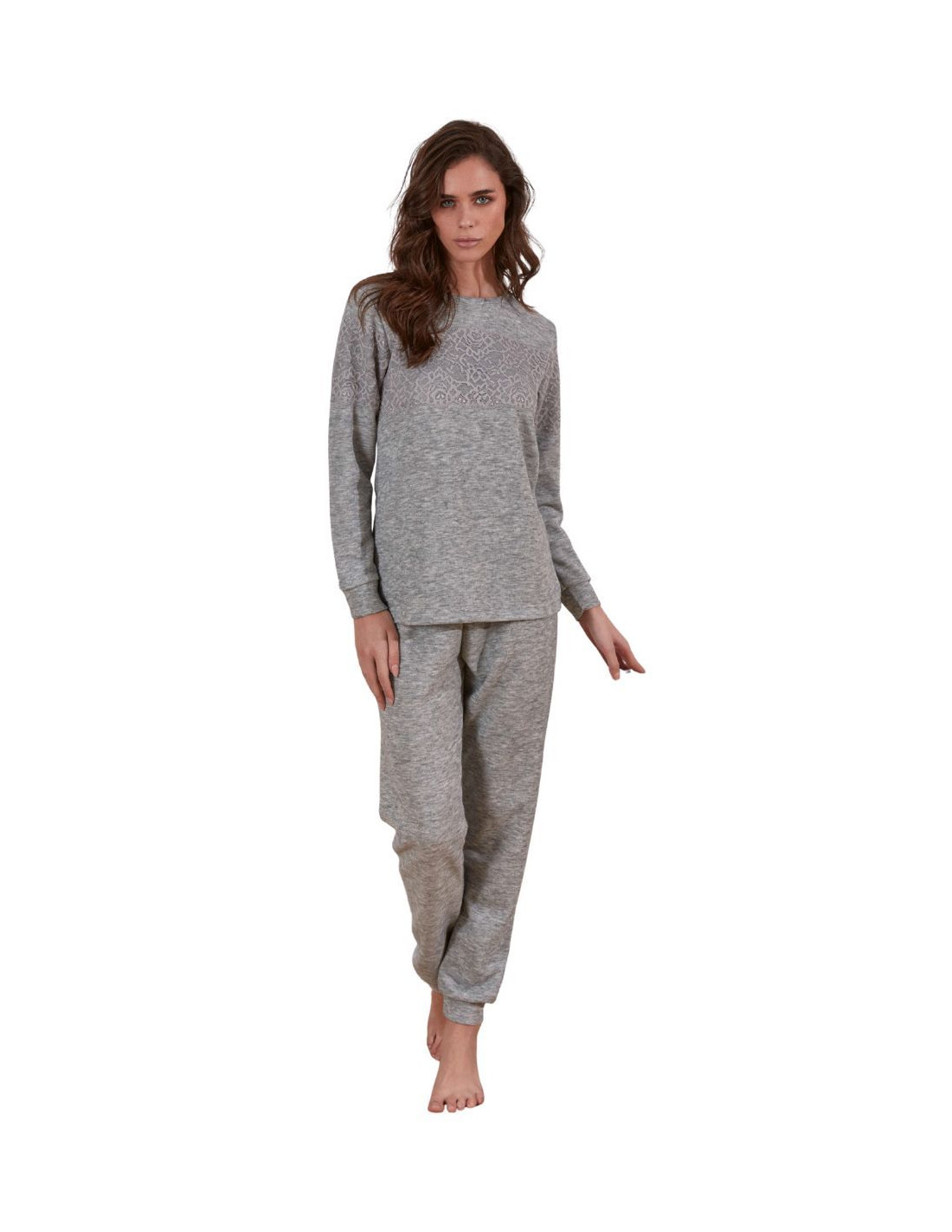 Pigiama donna girocollo in CALDO jersey punto Milano melange con inserto in pizzo sovrapposto, pantalone con polsini.