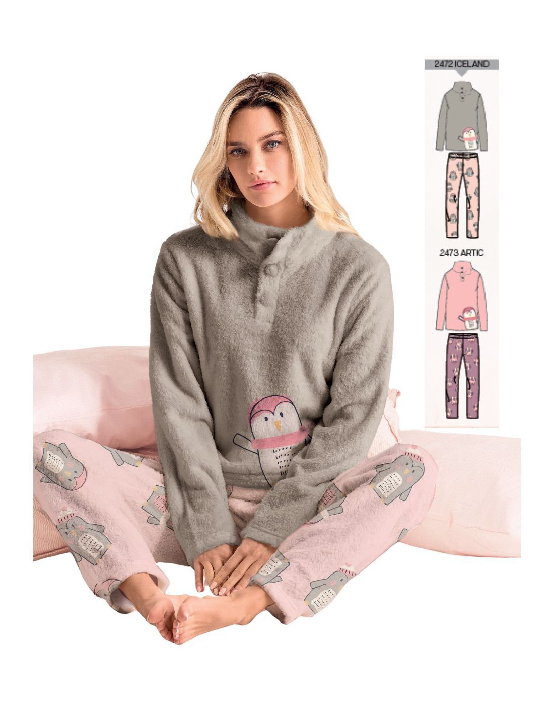 Pigiama a serafino con bottoni in CALDO e morbido PAIL CORAL con stampa pinguini e pantalone fantasia senza polsini.