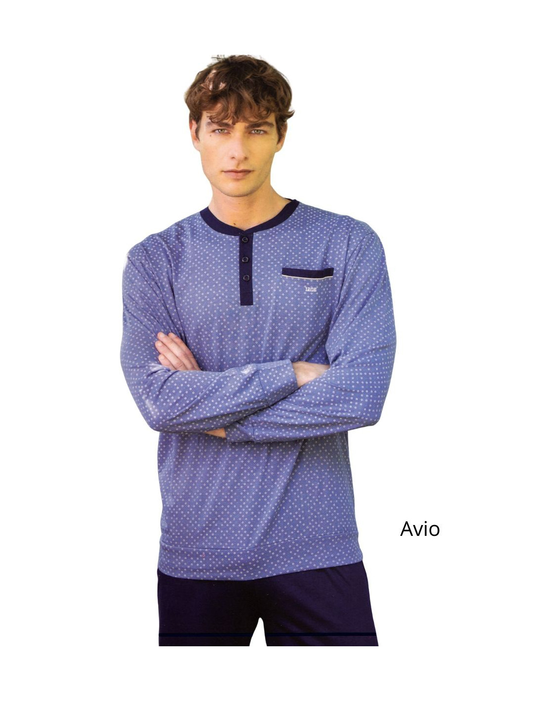 Pigiama uomo a serafino in jersey di cotone fantasia geometrica, taschino e pantalone lungo con polsini.