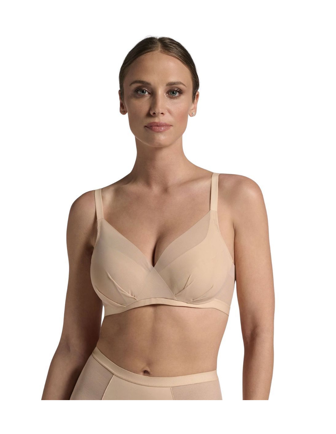 Reggiseno con ferretto sfoderato in microfibra con inserti in micro tulle. E' realizzato con una balza in tulle Powernet che assicura un contenimento efficace del sottobraccio senza segnare, per una vestibilità morbida e rassicurante. L’ampia scollatura centrale è elegantemente velata da un tulle 20 denari incrociato sul davanti, impreziosito dalle pieghe distintive della serie, che donano al modello un’eleganza sofisticata e una vestibilità sorprendentemente moderna.