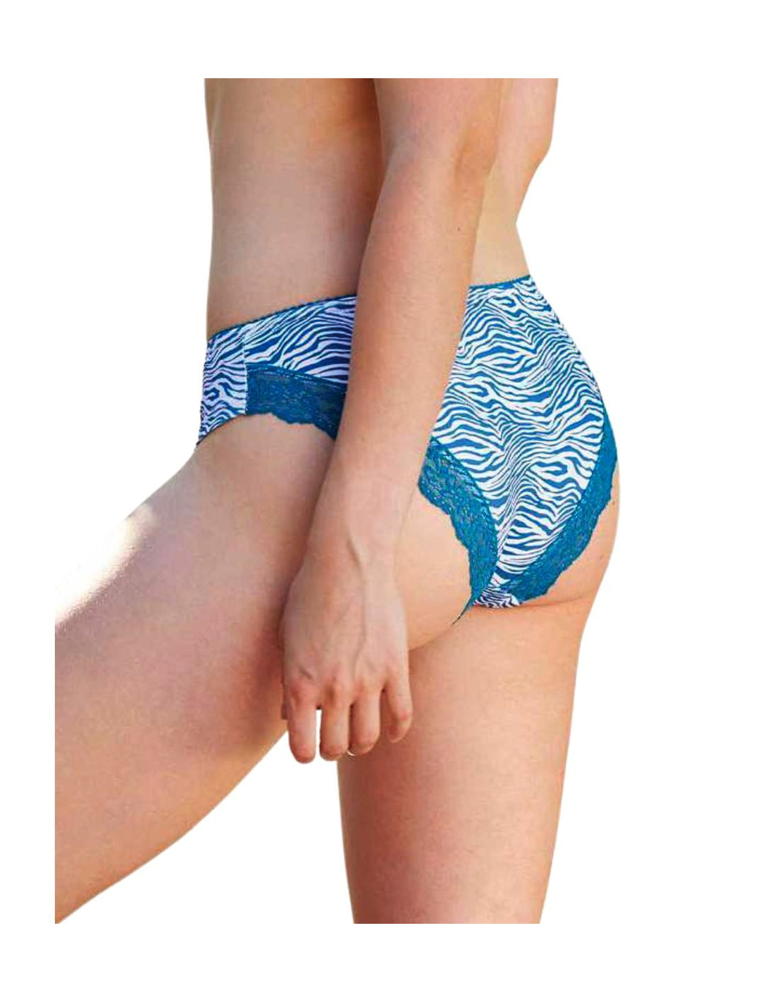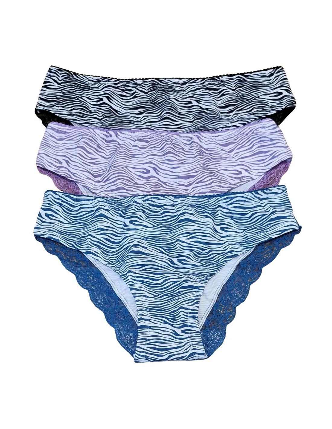 Gruppo 3 slip donna in cotone elasticizzato fantasia con inserti in pizzo dietro.