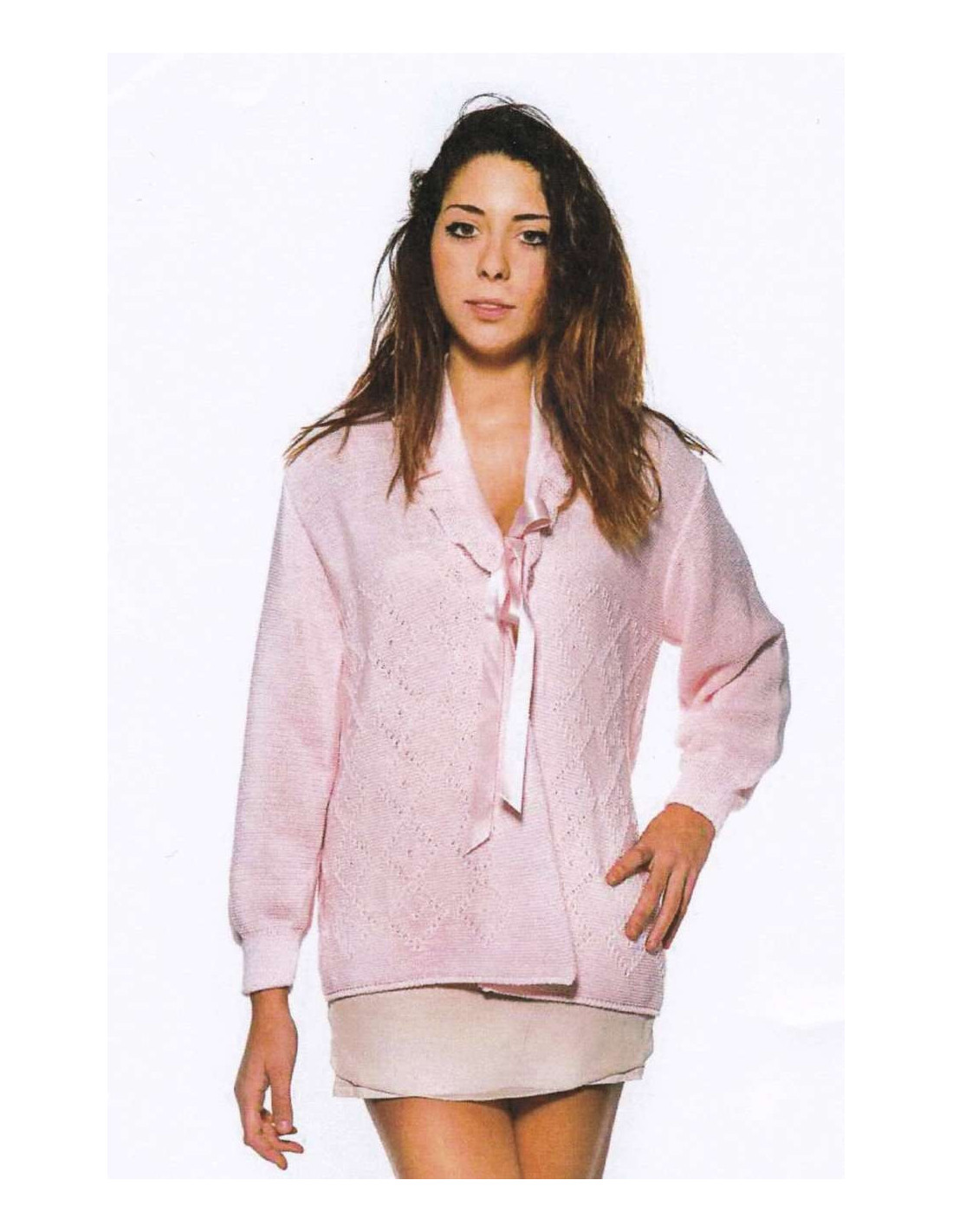 Maglia maniche lunghe, ideale per coprire le spalle anche quando si è a letto, allacciata con un fiocco di raso e 1 bottone.
